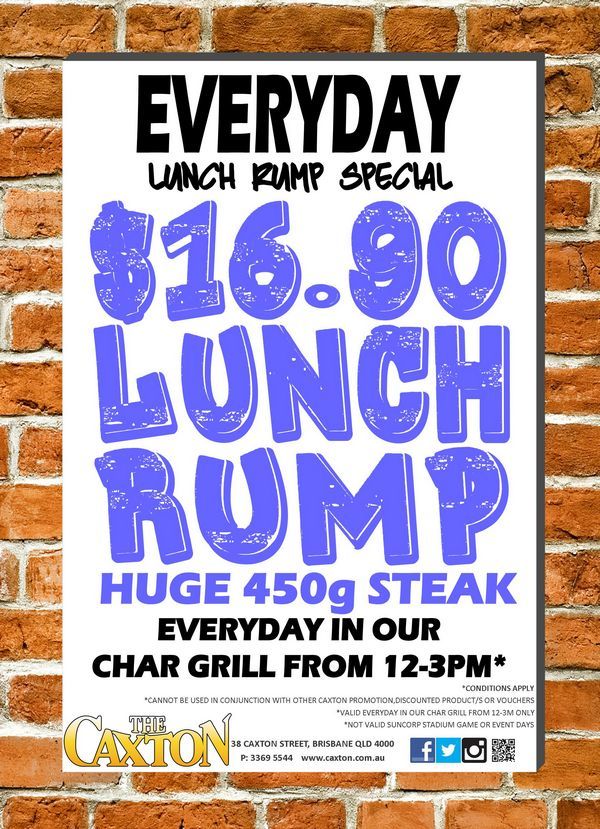 Everyday Lunch Rump Special. $16.90 Lunch Rump Special. Available in our Award Winning Char Grill Restaurant from 12-3pm. Mouth-watering 450g Rump cooked to your liking, sauce of your choice, served with an Idaho potato or beer battered fries & salad.